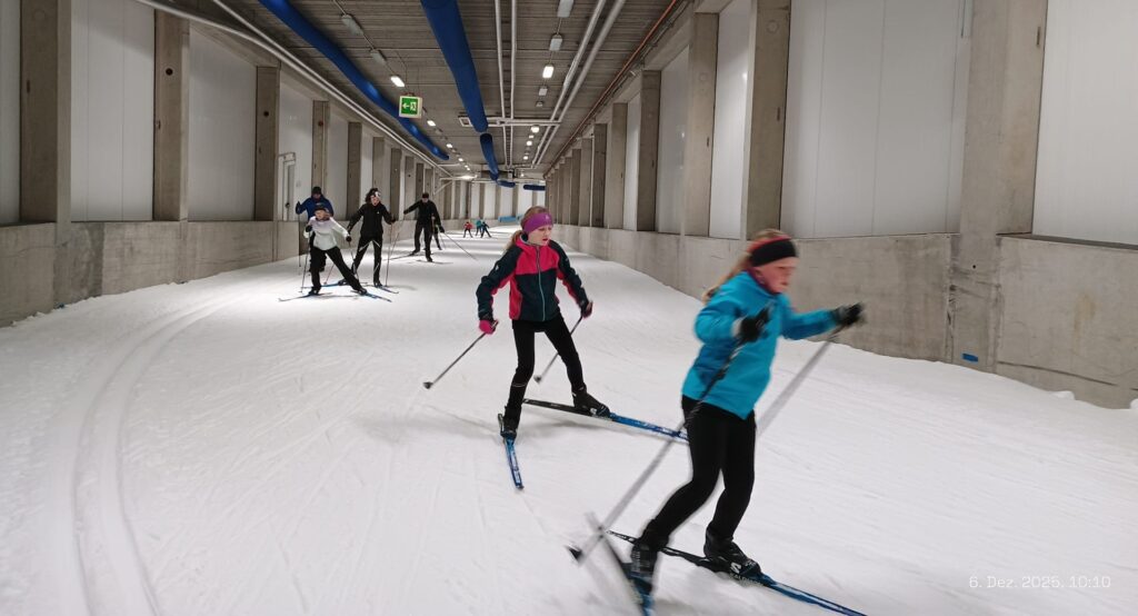 Die kurze Anreise am Freitag hat es ermöglicht, nach der Ankunft auf die Ski zu gehen. Nachdem eingecheckt und die Zimmer eingerichtet waren, wurde zur Skihalle aufgebrochen. In zwei Gruppen wurde an der klassischen Technik, bzw. der Skating-Technik gearbeitet.