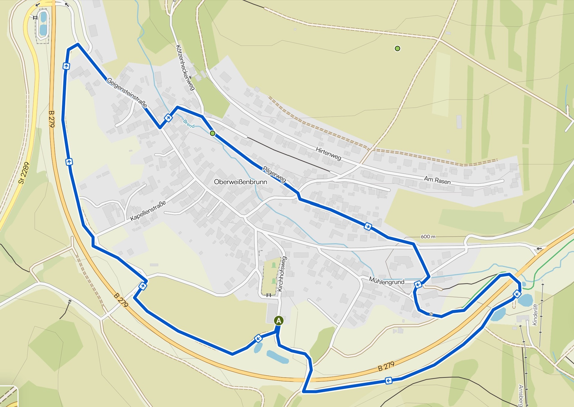 Auf einem schmalen Fußpfad geht es hinab bis zum Gasthof Mühlengrund. Hier biegen wir nach rechts und sofort wieder nach links ab. Wir folgen dem Wirtschaftsweg nach links wendend in den Mühlengrund. Nach der Unterquerung der B279 biegen wir rechts ab. Dem ansteigenden Wegverlauf folgend führt die Runde unterhalb des Arnsbergs parallel zur B279, mit schönem Ausblick auf den Ort entlang, bis wir nach rechts abbiegend erneut die B279 unterqueren und nach der Brücke links abbiegen. Nach kurzem steilen Anstieg ist die 2700m lange Dorfrunde absolviert und der Ausgangspunkt am Wanderparkplatz in Oberweißenbrunn erreicht.